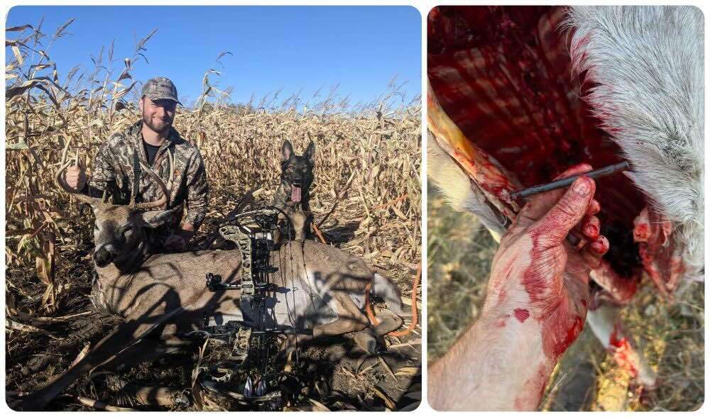 John was hunting over a monochromatic cornfield in early October where a good-sized 4x4 whitetail had been making the rounds. John got a shot at this buck in the late afternoon, and as these things happen, the buck ducked in its tracks at the last possible second and the arrow hit high.