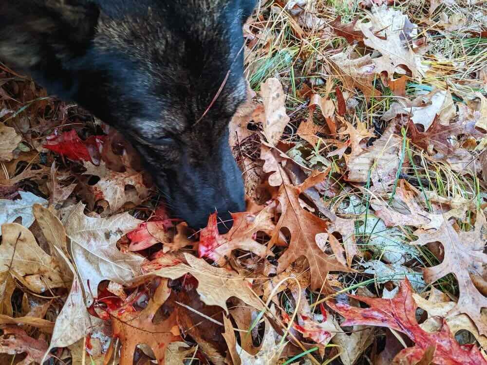 Stern plucked along the 100 yards of known blood in no time, and she brought us right to where John had heard the buck get up. Here, I examined the pointy end of John’s arrow. While I looked over the broadhead, Stern paused to check the breeze with her dusty black nose in the air, and suddenly changed her trajectory from a steady pace toward the dirt road to a mad dash heading completely away from the blood trail and dirt road.
