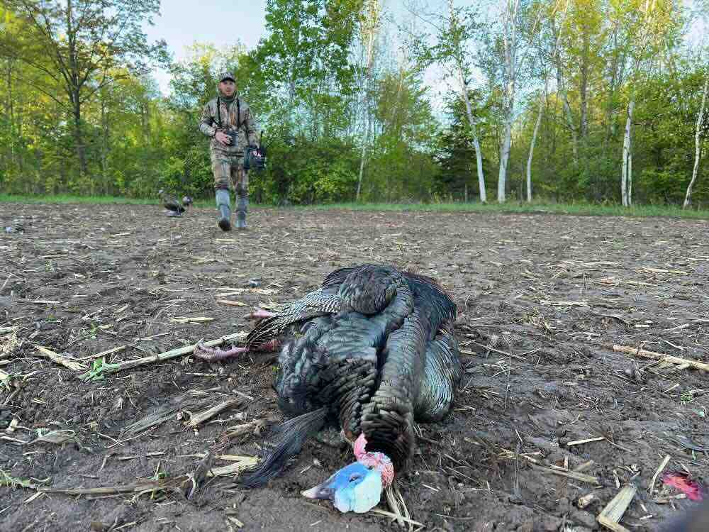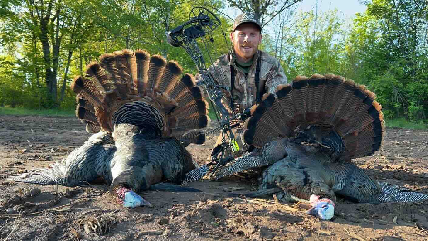 Suddenly, two strutting toms ran into the field, and I instinctively drew my bow before they hit my shooting window. At 12 yards, one strutter paused head-on beside the jake decoy, and I released, striking him perfectly beneath the neck. He ran straight away and disappeared over a hill. He was well-hit and wouldn’t go far.