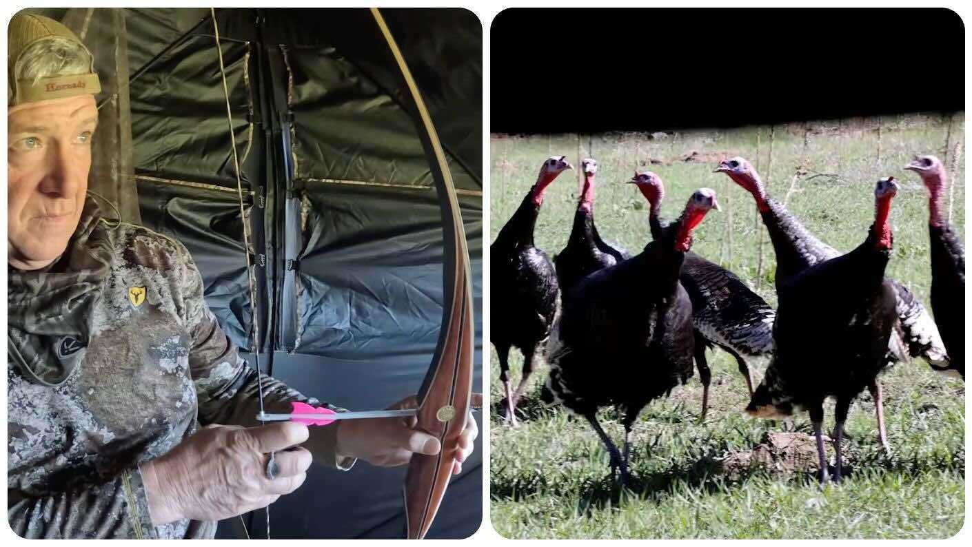 As for other gear used on this hunt: Eichler is hiding in a Cabela’s pop-up blind, which allows him to draw his longbow without alerting the nearby birds. A strutter decoy from Montana Decoy Company helped lure in the jakes from a distance, and a taxidermy hen turkey holds their attention long enough for a shot.