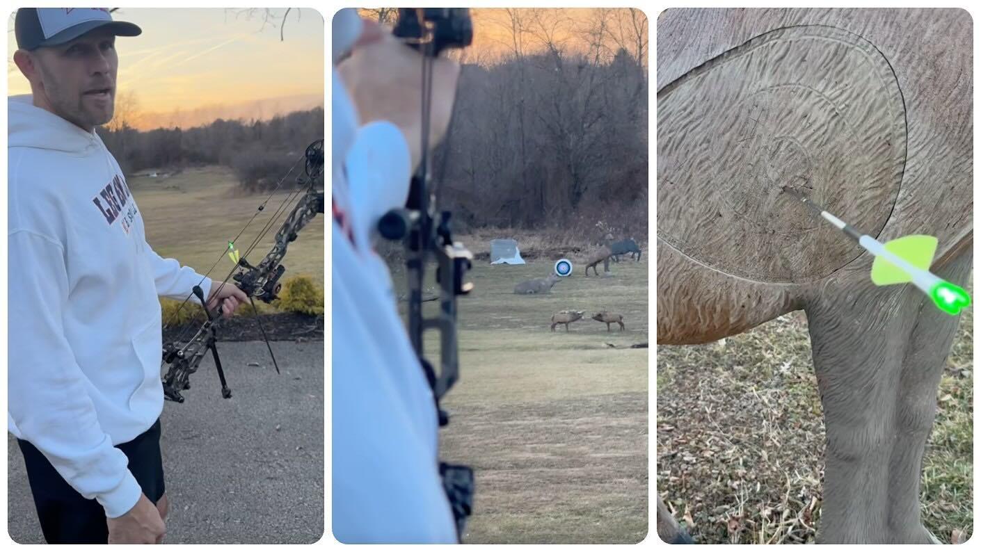 He’s shooting a Mathews ARC 34 (he mistakenly says 33) and LRP Arrow System at about 300 fps. The target is a 3-D red stag, and as you’ll see, Morgan centerpunches it.