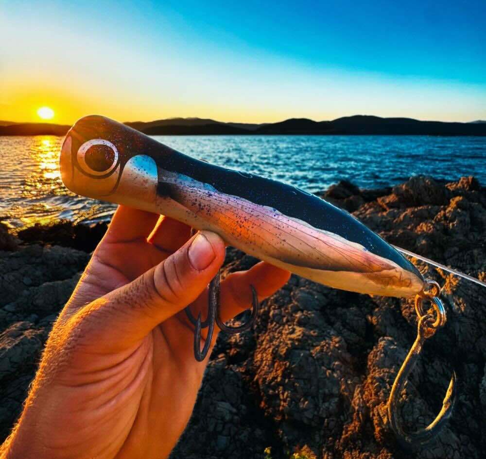 Ivan is using heavy-duty spinning tackle and twitching a popper (photo below) on the surface. When this particular bluefin strikes, Ivan knows immediately that he’s in trouble. He says, “It’s way too big — too big!”