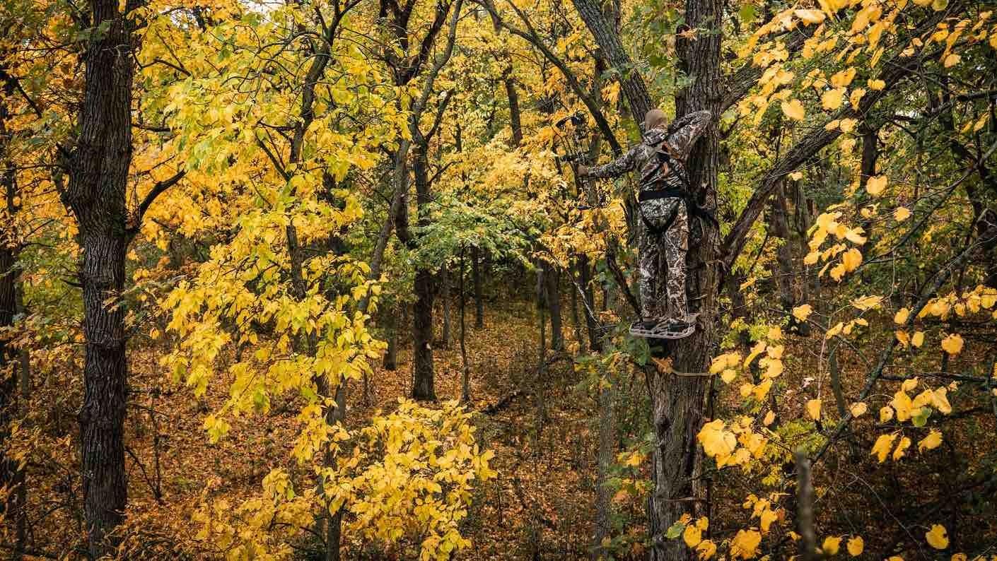 Next, never climb without a harness and climbing strap, and once you reach the height with your climbing gear where you’ll hang your stand, attach a Hawk Hunting Safety-Line or equivalent so you can be attached every single time you climb that tree from the moment your feet leave the ground until the moment they return. It’s been said countless times that most treestand falls occur during the climb or descent, which means you should always be buckled in.